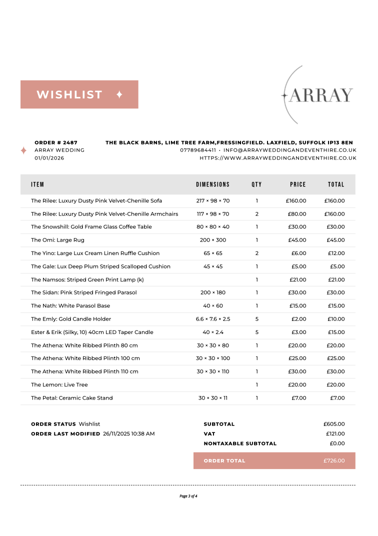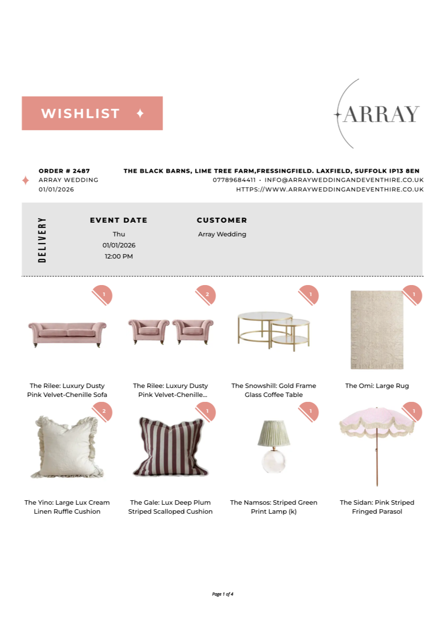 This can be done by simply heading to our Hire Catalogue and clicking on the item you would like to view. You will then see a love heart button ♡ Click this to “Add to Wishlist” and tweak your amounts!